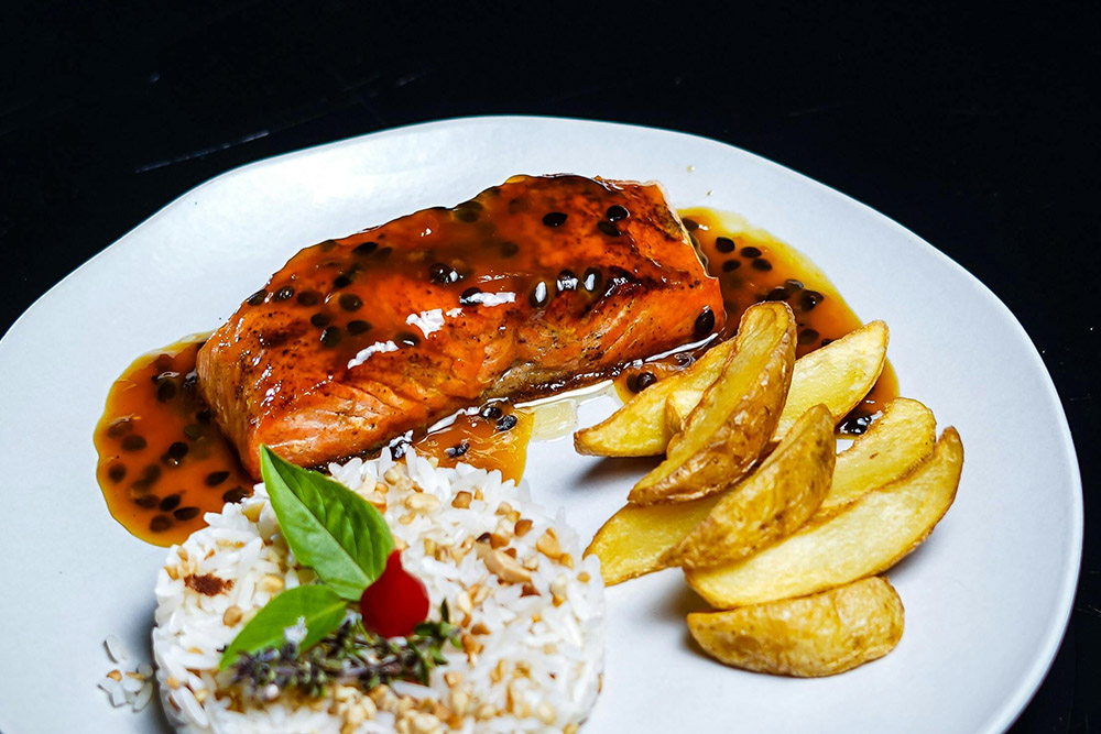 Faça uma mistura com molho de soja, gengibre fresco ralado e tâmaras trituradas. Pincele o salmão e leve ao forno por 10 a 12 minutos. A cobertura carameliza e deixa um sabor delicioso.